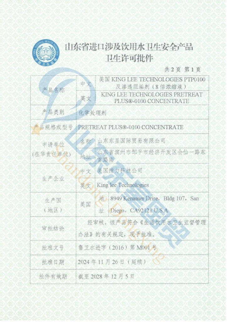 山东东星国际贸易有限公司是美国清力科技公司(KingLee Technologies)中国独家总代理,为中国境内的反渗透系统企业提供特种化学品和技术服务。公司主营反渗透阻垢剂、杀菌剂、清洗剂等水处理药剂。适用于各类水质,在电力、化工、电子、医药、食品、海水淡化等领域被广泛应用。